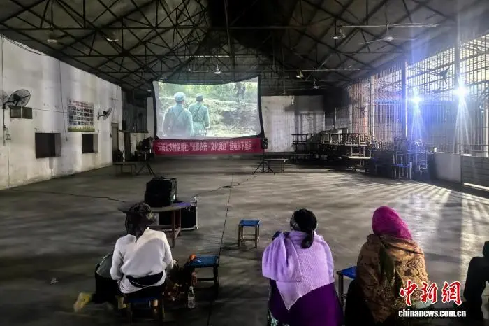 12月23日晚,在云南省芒市风平镇风平村委会弄相村民小组的公房内,村民们正在观看电影。张崇喜 摄