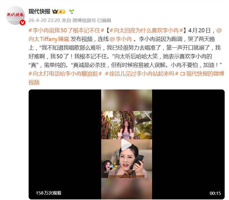“我不知道我唱歌那么难听,第一声开口就崩了……我好难啊,我50了!我根本记不住!”,据4月20日晚间报道,演员李小冉这段丝毫不做作的连线吐槽,直接把对面的向太陈岚给逗得哈哈大笑。